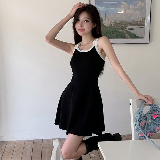 Instahot Contrast Color Double-Shoulder Strap A- line Dress 2023 New Slim Fit Waist-Controlled Slimming A- line Slip Dress