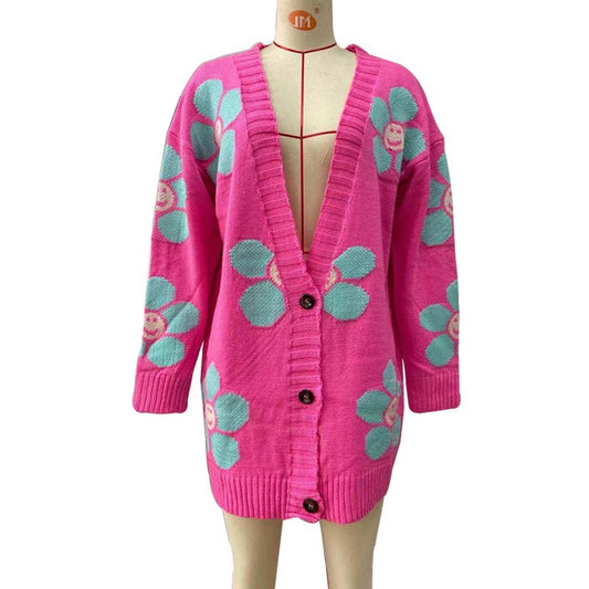 Fashion Ins Retro Sexy Sweet Barbie Pink Love Contrast Color Loose Mid Length Long Length Knitted Cardigan Knitted Coat