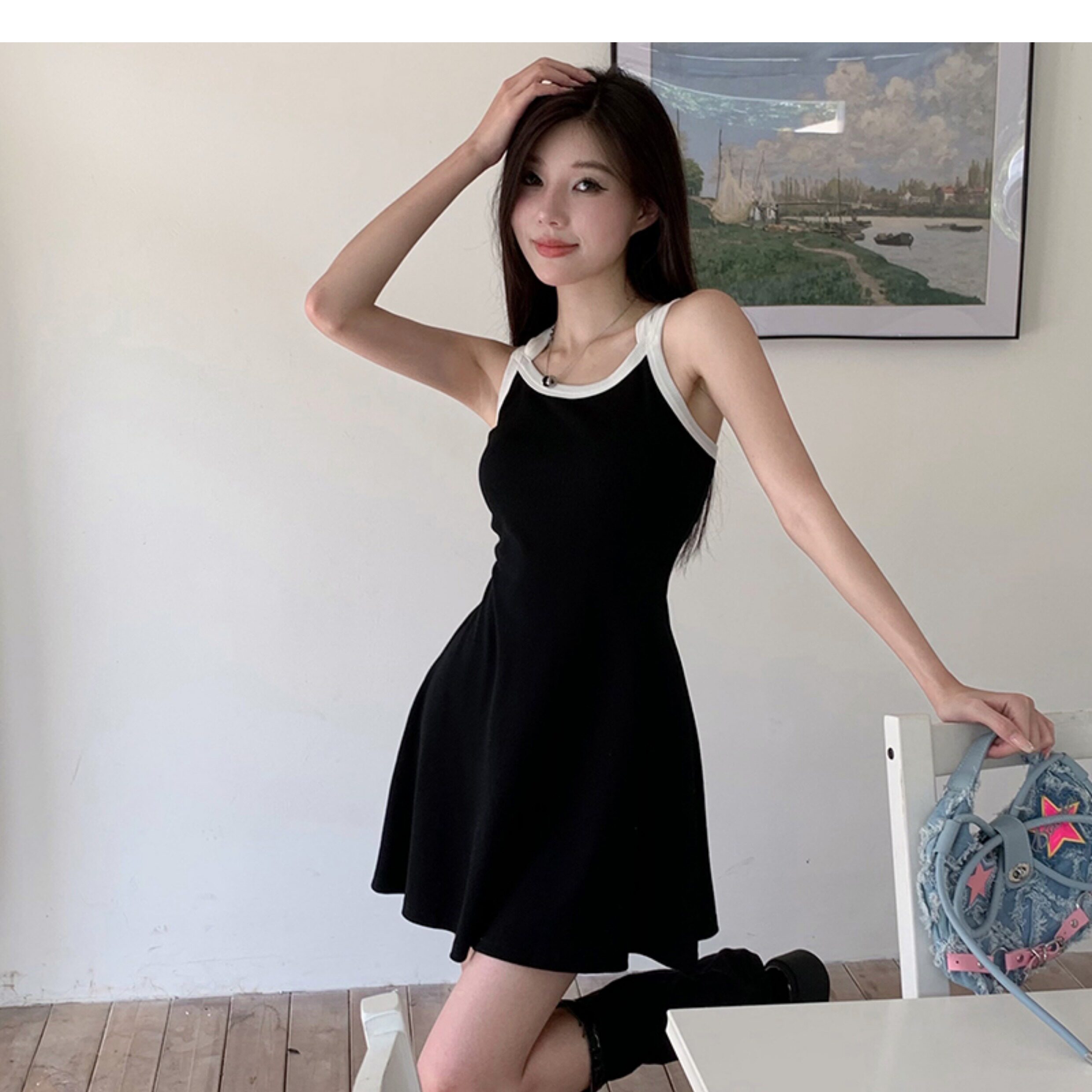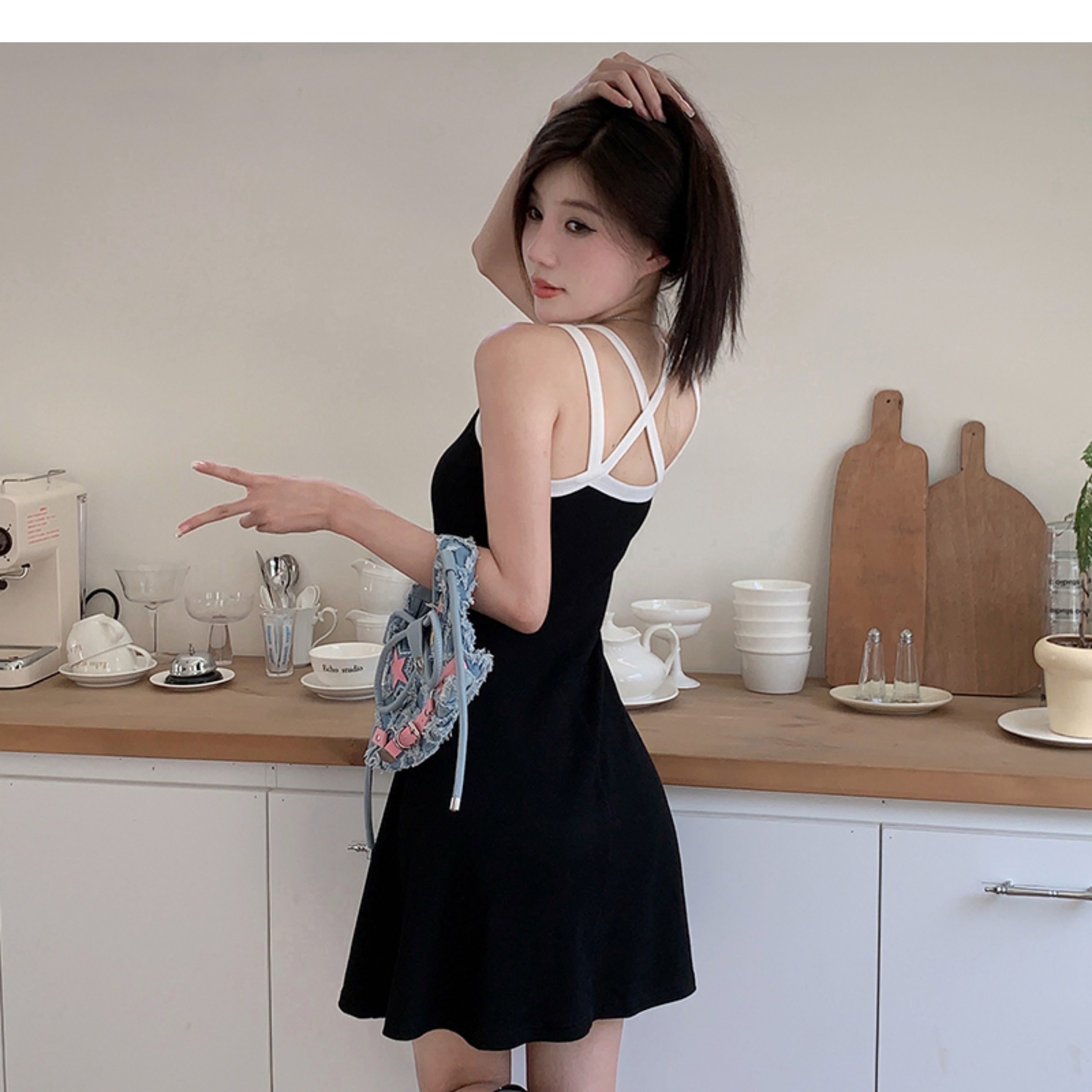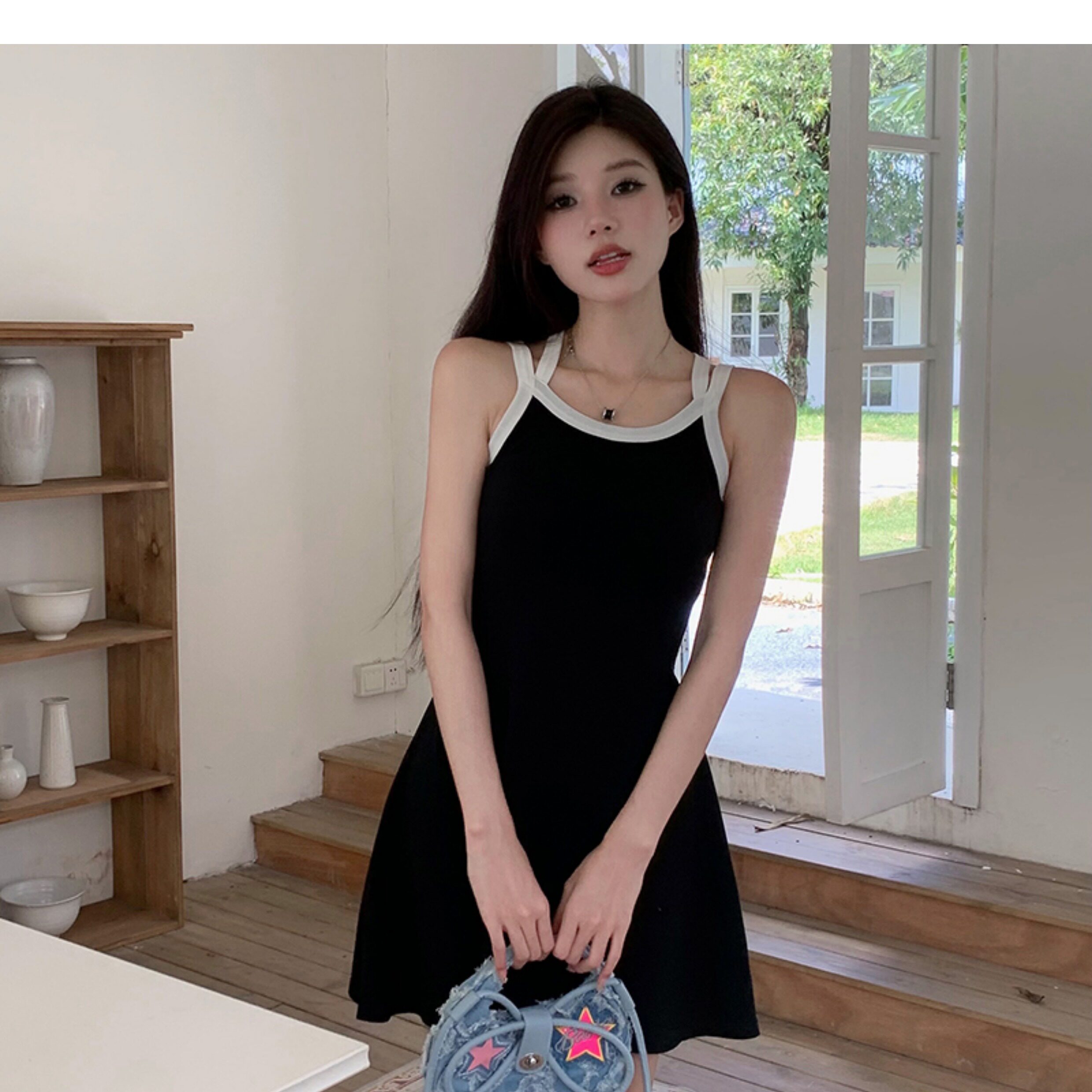 Instahot Contrast Color Double-Shoulder Strap A- line Dress 2023 New Slim Fit Waist-Controlled Slimming A- line Slip Dress